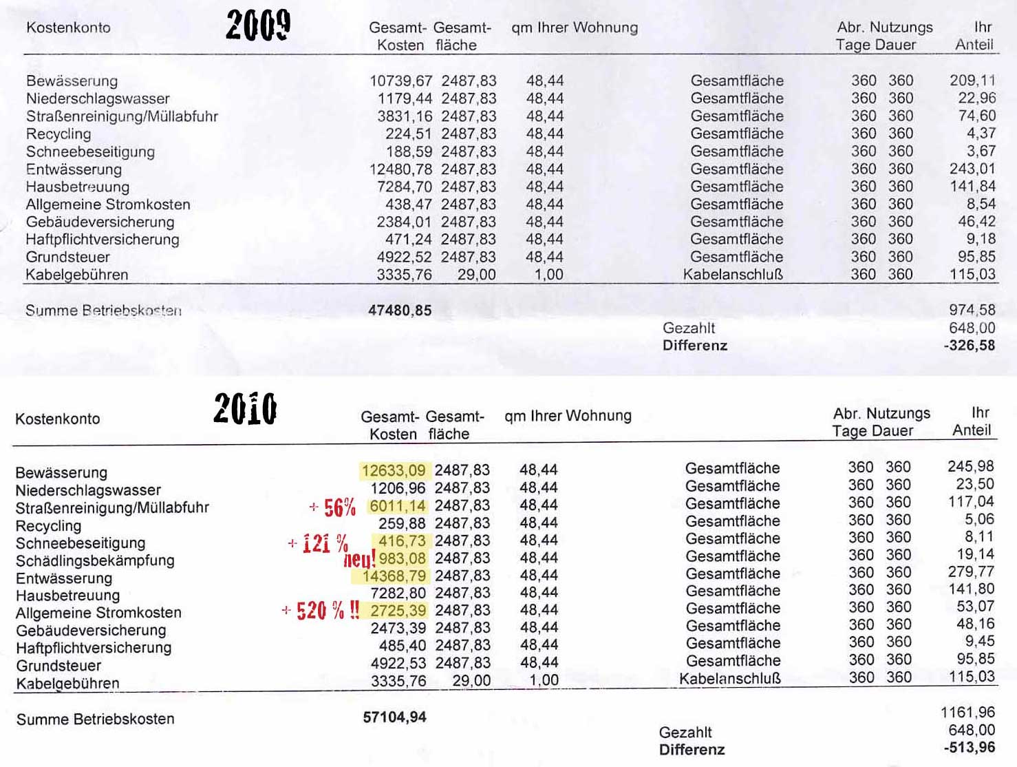- Der Größte Witz: Für Licht im Treppenhaus soll im Jahr 2010 2700 Euro verbraucht wurden sein. Eine Steigerung von über 500% gegenüber dem Jahr zuvor. Für das Geld kann man ein Jahr lang einen miesen Plattenbau in Marzahn im grellen Licht erleuchten lassen. Der totale Witz, wenn man auch berücksichtigt, dass das Licht weder im Keller noch im Treppenhaus vollständig funktioniert.