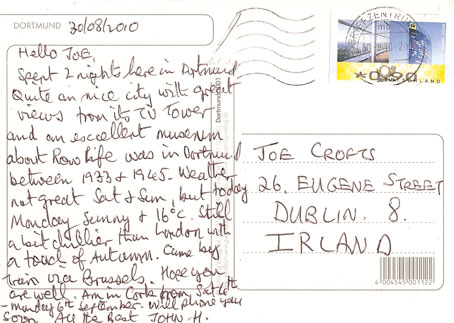 Wer kennt das nicht? Der Briefkasten wird geöffnet und es kommt einem Post entgegen, die eigentlich an den Nachbarn gehen sollte oder völlig woanders hin. Und wenn der Briefträger gar nicht mehr weiter weiß, lässt er Briefe, die er nicht zuordnen kann, einfach im Hausflur liegen. Irgendwann schmeißt ihn dann das Reinigungspersonal weg. Heute gab es einen ganz interessanten Fall. Es kam eine Postkarte ins Haus geflogen. Eine Ansichtskarte aus Dortmund von John. Der Empfänger war ein Joe. Ein Joe in Dublin, der irischen Hauptstadt. Um genauer zu sein war es „Dublin 8“ was wohl wiederum ein Teil der irischen Hauptstadt sein muss. Und tatsächlich, die Karte landete in Dublin. Und zwar in der Dubliner Straße 8. Nicht in Irland, sondern in Berlin. Auch, wenn ganz groß IRLAND auf der Karte stand. Na ja, so kann man sich täuschen. Aber selbst der Briefträger konnte offensichtlich nicht lesen. Arme Deutsche Post AG, nicht nur Schlangen bis auf die Straße in den Filialen, weil nur 2 von 10 Schaltern geöffnet sind, jetzt auch noch Personal was noch nicht einmal lesen kann....oder will. Wie man es eben sieht. Peinlich für das Unternehmen und für das Land, weil das Unternehmen das Wort „Deutsch“ missbraucht.