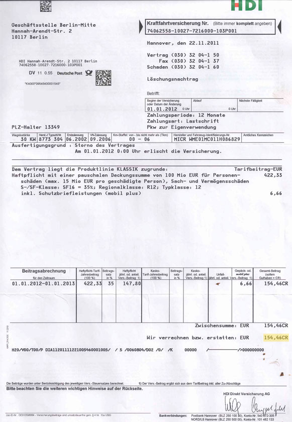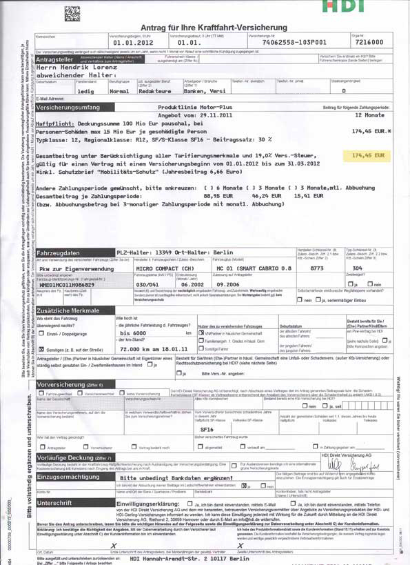 Nachdem ich meine Autoversicherung bei der HDI gekündigt hatte, weil mir die neue Kalkulation zu hoch war, gab ich dem Verein schriftlich noch einmal die Gelegenheit ein neues Angebot zu erstellen. Das kam dann auch prompt. "Sehr geehrter Herr Lorenz, schön das wir sie als Kunde behalten können". Das klang ja schon mal vielversprechend. Ein Blick auf die neue Kalkulation und ich musste mir erst einmal die Augen reiben. Die neue Kalkulation war dann doch glatt noch einmal 20 Euro höher als das Angebot zuvor. Die HDI hat anscheinend zu viel Geld oder einfach nur völlig inkompetente Mitarbeiter. Anders kann man so wohl kaum verstehen, wie eine solche dumme Kalkulation zu Stande kommen kann. Naja - eine zynische Antwort kann ich mir jetzt nicht verkneifen, aber unterschreiben tue ich da in meinem Leben wohl nicht mehr ;)