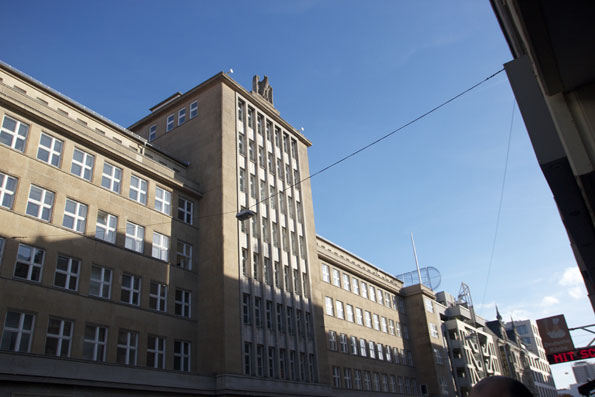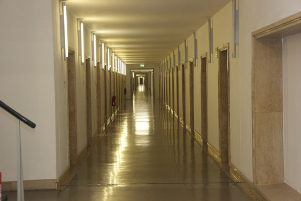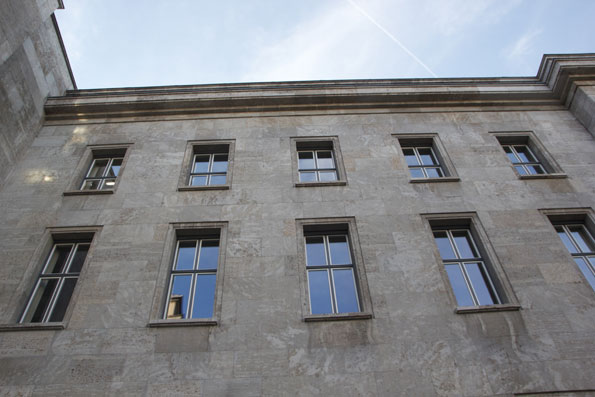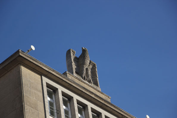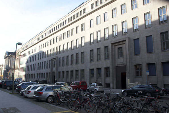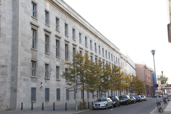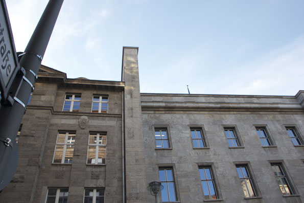 Ich habe es mal wieder getan. Zum zweiten Mal in diesem Jahr, ziehe ich mir eine Woche lang dunkele Geheimnisse aus der ehemaligen Reichshauptstadt rein. Natürlich ist es wieder ein Seminar der Berliner Unterwelten im Rahmen meines mir vom Gesetz her zustehenden Bildungsurlaubs. Der imposante Titel diesmal: „Reichshauptstadt Germania“. Das im voraus schon ausgebuchte Seminar hatte kurzfristig doch noch freie Plätze anzubieten. So startete also das Seminar heute in den all ehrwürdigen Räumen der Berliner Unterwelten im U-Bahnhof Gesundbrunnen. Los ging es dann mit einem Vortrag von Michael Richter, der schon im Seminar „Verkehrstechnik“ am Potsdamer Platz referierte. Ein kleiner Ausflug in die Architektur und in die Bauverwaltung des 3. Reiches. Der erste Außentermin war dann die Friedrichstraße. Aufgrund der Massen an Touristen und den damit verbundenen Trubel etwas anstrengend, aber keineswegs uninteressant. Erstaunlicherweise gibt es gerade auf der Touristenmeile allerhand Bausubstanz aus der NS-Zeit zu besichtigen. Jeder geht daran vorbei, doch die wenigstens wissen und erkennen, aus welcher Zeit die Gebäude sind, machen sie teilweise einen immer noch modernen Eindruck oder geben ihr düsteres Geheimnis erst auf den zweiten oder dritten Blick preis. Das Gebäude des Arbeitsamts Mitte ist ein echter Hingucker. Nur wer nach oben schaut, wird schnell merken aus was für einer Zeit dieses riesige Gebäude stammt. Ganz oben thront noch der riesige Adler über dem Komplex, der sich über zwei Straßen erstreckt. Gleich weiter um die Ecke das Gebäude der heutigen Zürich Versicherung. In den Wirren der Nachwendezeit hatte sich die bekannte Schweizer Versicherung das Gebäude unter den Nagel gerissen und aufwendig saniert. Der imposante Bau wurde nach 1943 noch einmal erweitert, aber architektonisch – wahrscheinlich aus Kostengründen – nicht dem eigentlichen Konzept angepasst. Wieder ein paar Meter weiter das heutige Ministerium für Gesundheit und Soziales. Wieder ein mächtiger Bau, der aufwendig saniert wurde. Bei genauen Hinschauen sind die Ausbesserungsarbeiten der vielen Schusslöcher aus dem Häuserkampf noch zu erkennen. Auch dieses Gebäude hat den Krieg weites gehend unbeschadet überstanden. Faktisch wurde eigentlich nur das Hakenkreuz an der Fassade entfernt. In der DDR Zeit diente der Komplex dem Ministerium für Medienpolitik. Das Highlight des Tages war dann allerdings das Bundesfinanzministerium – das ehemalige Reichsluftfahrtministerium von Hermann Göring. Hier war dann auch endlich mal eine Innenbesichtigung möglich und es hat sich gelohnt. Ein unfassbar, architektonisch schönes bombastisches Gebäude mit einer Geschichte die einzigartig ist. In dem heutigen Saal, indem meistens die Pressekonferenzen abgehalten werden, wurden berühmte Sätze wie „Niemand hat die Absicht eine Mauer zu errichten“ ausgesprochen. In einem anderen Saal, der für Konferenzen des Ministeriums genutzt wird, redete Göring mit Goebbels um die Endlösung der Judenfrage – noch vor der bekannten Wannsee-Konferenz. Eine Fahrt mit dem Paternoster in den 7. Stock führte abschließend zu einer tollen Aussicht auf Berlin von Dach des Ministeriums.