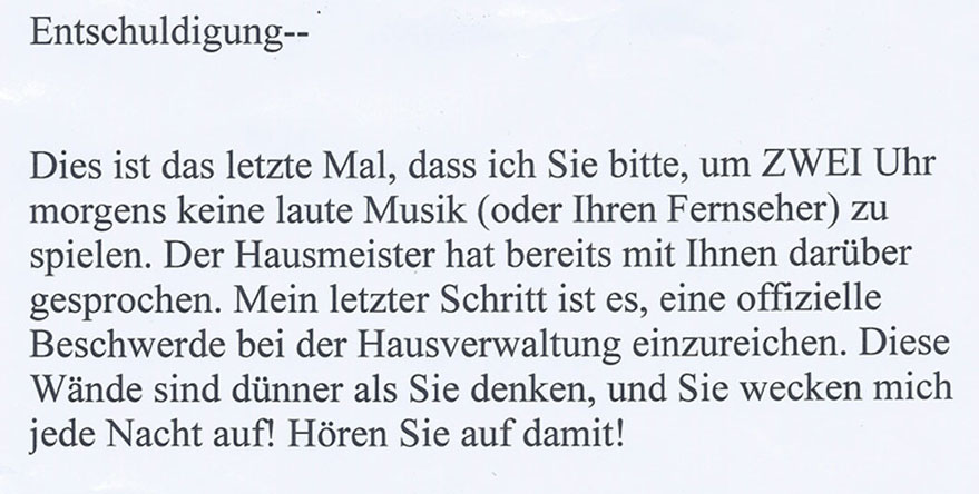 Heute war ein merkwürdiger Tag. Ich fand an meiner Wohnungstür eine freudige Botschaft (Paket ist angekommen) und eine weitere recht komische Nachricht in Form eines gefalteten DIN A4 Bogens (siehe Scan oben). Ein „Nachbar“ fühlt sich von mir angeblich in seiner Nachtruhe gestört. Der „Nachbar“ droht mir in dem Schreiben mit der Hausverwaltung, sollte die nächtliche Ruhestörung nicht unterbunden werden. Angeblich hätte der Hausmeister auch schon mit mir gesprochen. Merkwürdig. Ich wohne seit 8 Jahren in dieser Wohnung und habe noch nie einen Hausmeister kennenlernen dürfen, geschweige denn habe ich jemals ein Gespräch mit einem Hausmeister geführt. Auch kann ich mich nicht an eine nächtliche Party mit Musikeinlage erinnern. Der TV ist immer recht leise geschaltet, wenn er denn mal läuft. Meinen letzten Hörtest beim HNO hab ich im Übrigen mit Bravour bestanden. Nun denn. Ja, es trifft zu, dass ich zu den Bewohnern des Wohnhochhauses gehöre, die nicht um 22 Uhr ins Bett gehen, sondern noch über einen normalen Biorhythmus verfügen. Da kann es schon mal etwas später werden und damit verbunden sind auch sicherlich gewisse Geräusche, die auf Leben hindeuten, vorhanden. Pissen, scheißen, spülen, telefonieren usw. Hin und wieder fällt auch mal etwas herunter. So ist das nun mal, wenn man mit 40 Parteien in einem Haus lebt und alle Mieter unterschiedliche Lebensweisen haben. Die in dem Schreiben bemängelten „dünnen Wände“ kann ich ebenfalls nicht ganz nachvollziehen, denn nach über 10 Jahren in einem Altbau in Berlin-Wedding weiß ich, was wirklich „dünnen Wände“ sind. Auffällig in diesem Wohnhochhaus mit 11 Stockwerken sind allerdings die Lärmquellen. Auch ich höre hin und wieder, wenn der Nachbar über mir seine Frau aufs Maul haut (obwohl, die Wohnung gar nicht direkt über mir liegt) oder wenn jemand ein Loch in die Wand bohrt. Gerade bei Letzteren ist die Lokalisierung der Lärmquelle in einem Hochhaus extrem schwierig. Von der Lautstärke her wird die Lärmquelle direkt unter sich vermutet, doch diese befindet sich oft Etagen tiefer. Nun, wer könnte dieser anonyme „Zettelschreiber“ sein? Auf meiner Etage befindet sich nur eine Familie, die der deutschen Sprache mächtig ist. Hier fände ich es schon schade, dass man als Nachbar nicht das Gespräch sucht, sondern lieber anonym Drohzettelchen verfasst. Aber das passt zum heutigen Zeitgeist. Anstatt kurz miteinander sachlich zu reden, wird lieber Inkognito gedroht. Ich sehe mich in keiner Weise schuldig und werde auch weiterhin nichts an meiner Lebensweise ändern. Wer ein psychisches Problem hat und eventuell dabei noch in Kombination mit einem leichten Schlaf, dem sei generell keine Wohnung angeraten, unter dessen Dach sich weitere 39 Mietparteien befinden. Eine „Unterhaltung“ mit der Hausverwaltung sehe ich relativ gelassen entgegen und freue mich darauf.